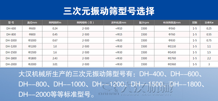 大漢機(jī)械所生產(chǎn)的三次元旋振篩型號有:DH-400、DH--600、DH--800、DH--1000、DH--1200、DH--1500、DH--1800、DH--2000等標(biāo)準(zhǔn)型號。