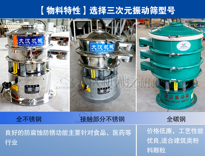 您可根據(jù)物料特性主要是決定您是適用哪種材質(zhì)的三次元振動(dòng)篩
