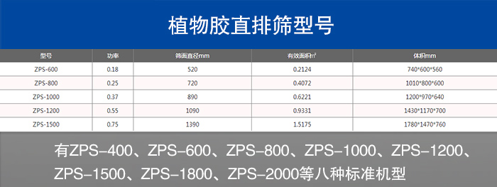 植物膠篩分使用的直排篩為單層篩分設(shè)備,它的直徑同旋振篩一樣,有ZPS-400、ZPS-600、ZPS-800、ZPS-1000、ZPS-1200、ZPS-1500、ZPS-1800、ZPS-2000等八種標(biāo)準(zhǔn)機(jī)型。