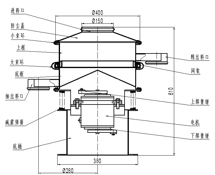 小型不銹鋼振動篩是一種常見的振動篩設備,它采用旋轉振動方式進行物料篩分。其結構主要包括以下幾個部分:
