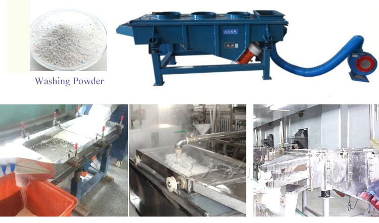 大漢機械降溫直線振動篩這對高溫特性物料設計研發,可在有效降低物料溫度后再對物料進行篩分,有效的提高了篩分效率及處理量,下面以洗衣粉為例說明風冷式振動篩的應用。洗衣粉在剛剛完成生產后,通常為120度左右的高溫,如不進行降溫處理,篩選分級非常困難,而洗衣服不適合傳統的水冷式降溫。在洗衣粉生產線上用“大漢牌”風冷式直線振動篩,剛生產完成120度高溫洗衣粉通過輸送設備直接進入風冷式直線振動篩,經過安裝在設備進料口底部的風機降溫冷卻系統,(不符合要求的結塊物料通過安裝在進料口端的篩網篩選后從出料口旁的小型排料口排出,見下圖,該裝置可根據物料特性選裝),可直接將洗衣粉溫度降至40-50度后再進入直線振動篩完成篩選分級工作。