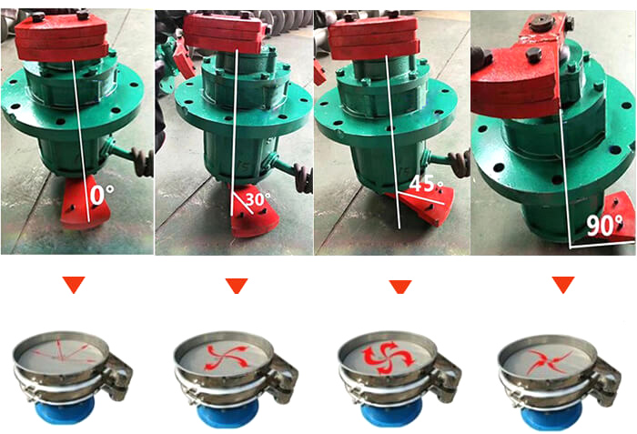 2、當你想讓篩面上的物料迅速向四周擴散或是加快擴散時,需要把旋振篩的電機夾角調(diào)小,比如調(diào)到30度,或是20度,或是更小,角度越小物料向四周擴散的越快,反之就會越慢,當角度達到90度時,物料就會向篩面中心集中。